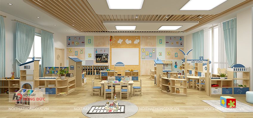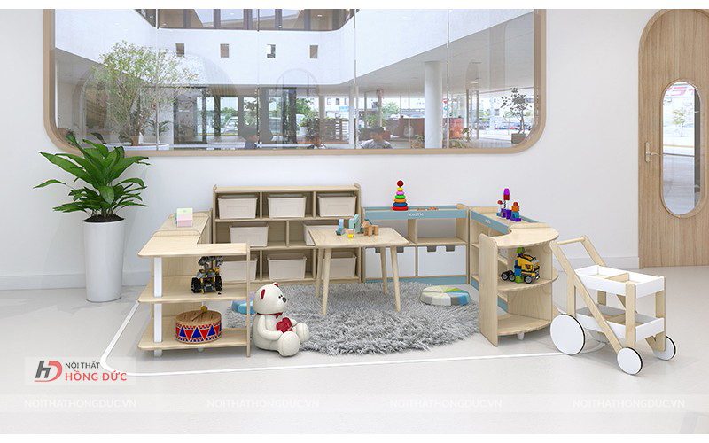 • Ưu tiên vật liệu thân thiện: Gỗ MFC chống ẩm, nhựa ABS, hoặc sơn phủ an toàn đạt chuẩn mầm non.