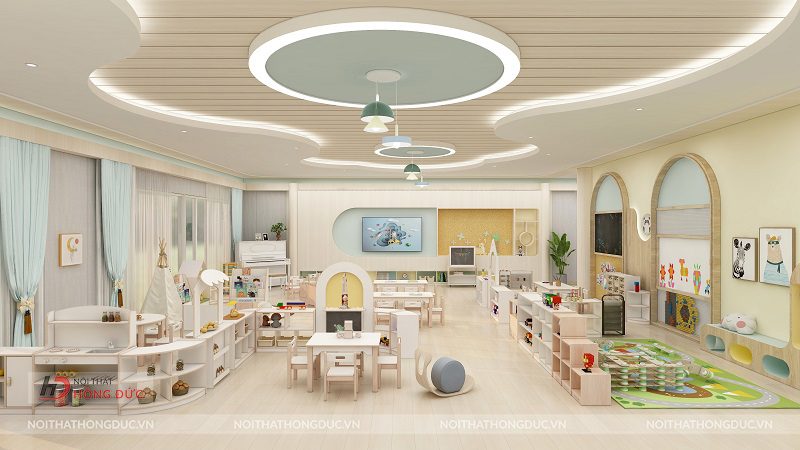 Thường thấy tại các trường mầm non hiện đại, nơi không gian được tối ưu linh hoạt.