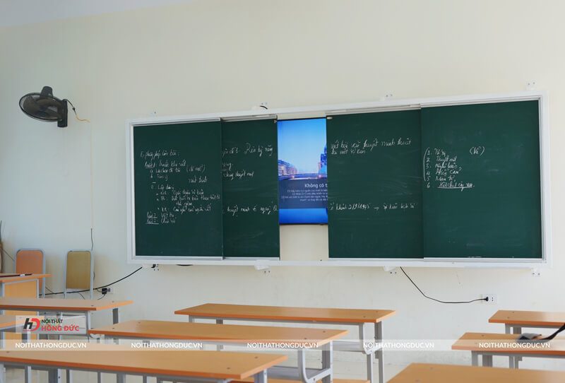 Thứ hai, khả năng tận dụng cơ sở vật chất sẵn có. Nhiều trường hiện đã được trang bị tivi, máy chiếu hoặc hệ thống dây điện sẵn trong phòng học. Khi lắp đặt bảng trượt, các thiết bị này có thể được tận dụng ngay mà không cần thay thế toàn bộ, giúp tiết kiệm đáng kể chi phí đầu tư mới.