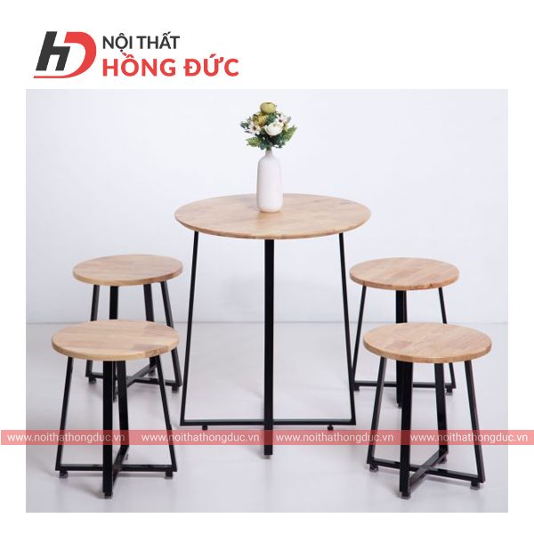 Bàn ghế Cafe tròn gỗ ghép thanh chất liệu khung làm bằng sắt sơn tĩnh điện màu đen, mặt làm bằng gỗ tự nhiên ghép thanh