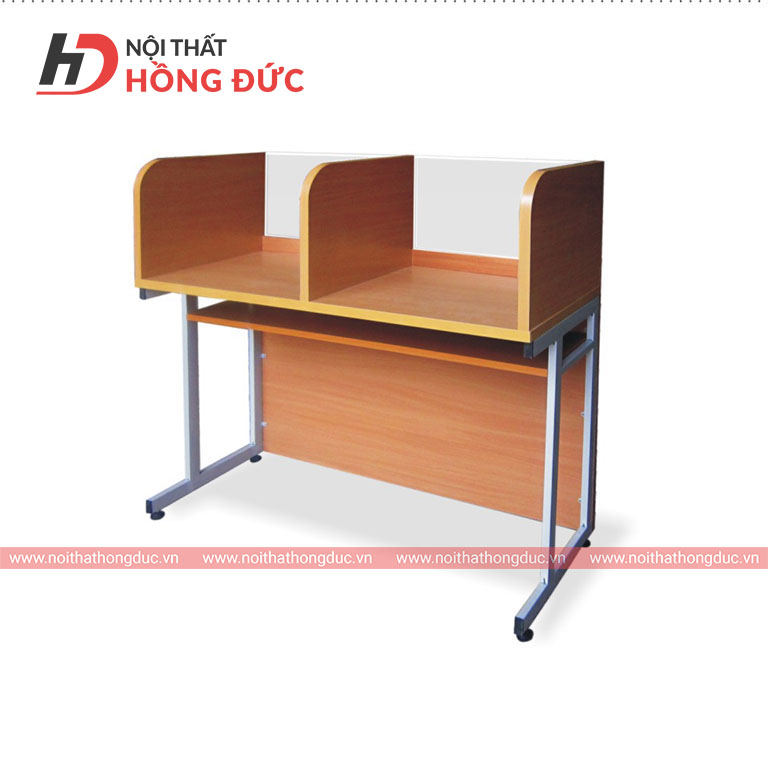 • Bàn có vách ngăn chia làm hai chỗ ngồi, khung chân sắt sơn tĩnh điện hình chữ T rất chắc chắn, có kính chắc trước