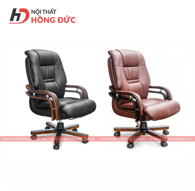- Ghế xoay lãnh đạo có tay điều chỉnh độ cao bằng cần hơi, mặt và tựa bằng đệm mút bọc da. Chân thép ống gỗ tự nhiên có bánh xe.