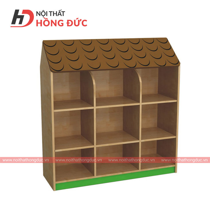 - Giá sách thư viện có thiết kế 3 tầng , mỗi tầng ngăn cách thành 3 học tủ con, có mái gỗ bên trên.
