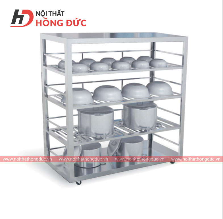 Giá úp xoong nồi, bát đĩa toàn bộ bằng Inox, Có bánh xe