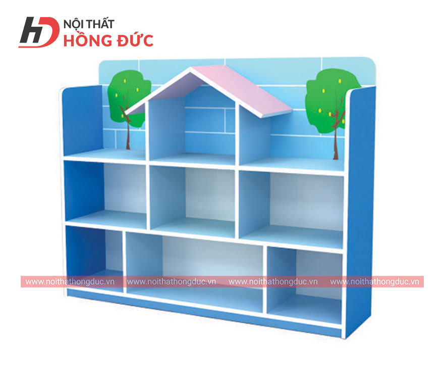 Kệ góc mầm non kiểu dáng hình ngôi nhà với màu sắc chủ đạo xanh dương giúp không gian phòng học mát mắt hơn. Sản phẩm được thiết kế thành các ngăn giúp việc sắp xếp đồ dùng, sách truyện cho trẻ một cách có khoa học. Kích thước tiêu chuẩn phù hợp với nhân trắc học của lứa tuổi mầm non.