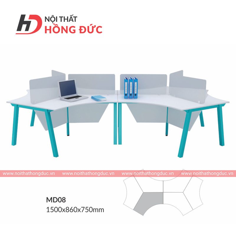 Module bàn làm việc MD08 được thiết kế hiện đại, phù hợp cho các không gian làm việc mở hoặc văn phòng sáng tạo. Với kiểu dáng cong mềm mại, chân bàn phối màu nổi bật, sản phẩm mang lại cảm giác trẻ trung, năng động. Bàn được chia thành 4 khu vực làm việc riêng biệt, kết hợp với vách ngăn kính mờ để tạo sự riêng tư mà vẫn giữ tính kết nối giữa các vị trí.