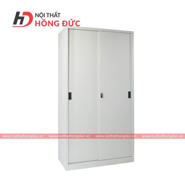 Tủ sắt cánh trượt, 2 khoang, 5 đợt, 2 mắc áo, 1 khóa. Chất liệu sắt sơn tĩnh điện.