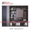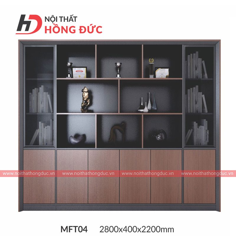 Tủ tài liệu MFT04 có thiết kế hiện đại, tối giản nhưng đầy đủ chức năng trưng bày và lưu trữ. Sản phẩm được chia thành 3 vùng rõ rệt: tủ dưới cánh mở, tủ giữa trưng bày và hai bên là kệ sách cánh kính – giúp không gian làm việc thêm gọn gàng và chuyên nghiệp.