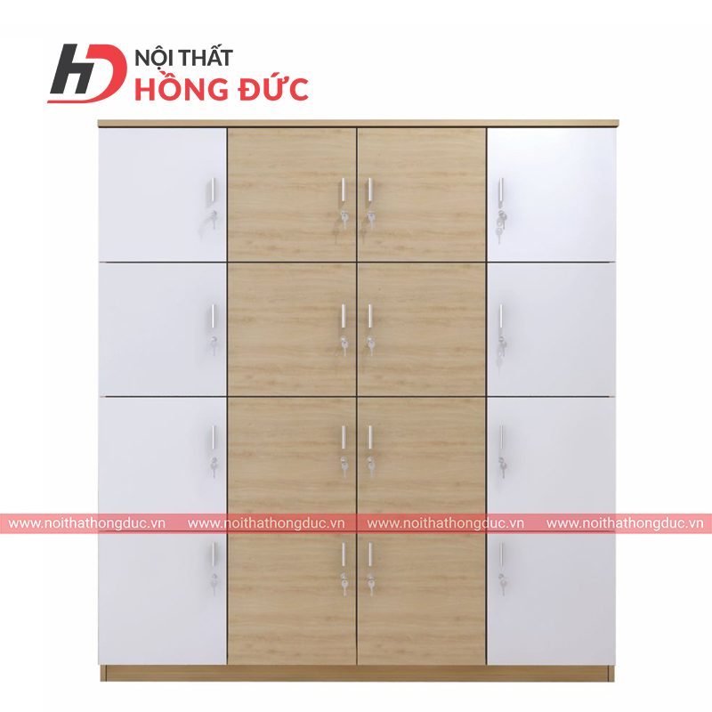 Tủ gồm 16 khoang chia thành 4 hàng x 4 cột, mỗi khoang có khóa riêng biệt.