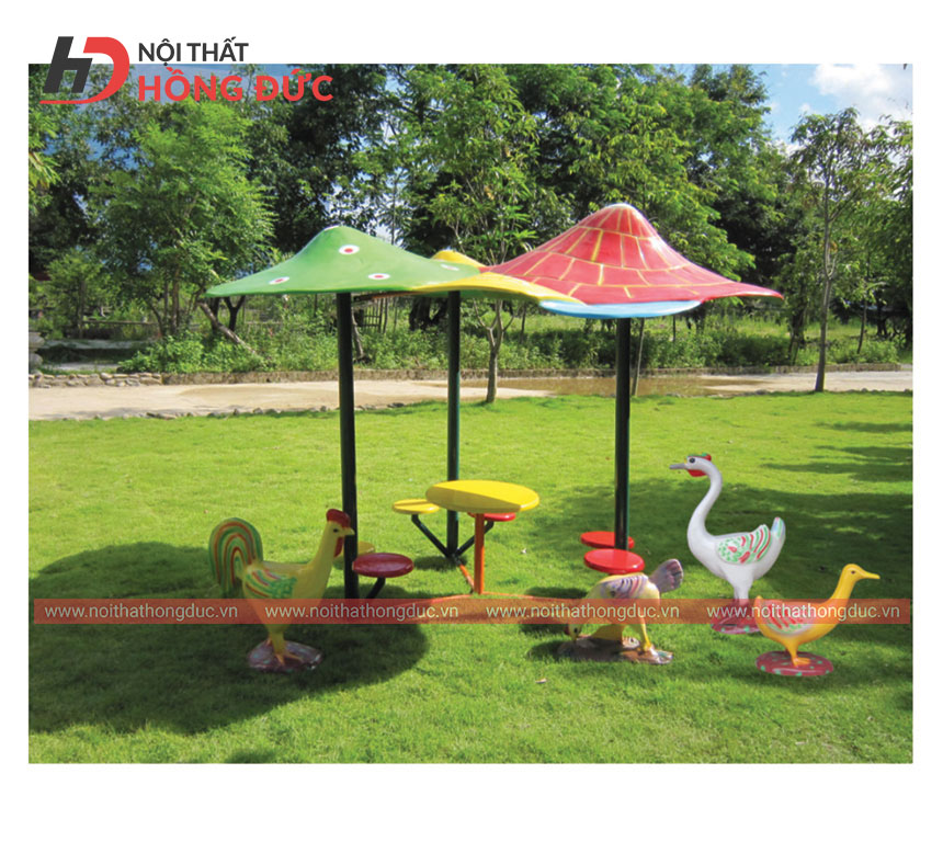 Vườn nấm Gồm 3 cây nấm, 1 bàn, 6 ghế, khung bàn ghế bằng sắt sơn dầu, Nấm bằng composite