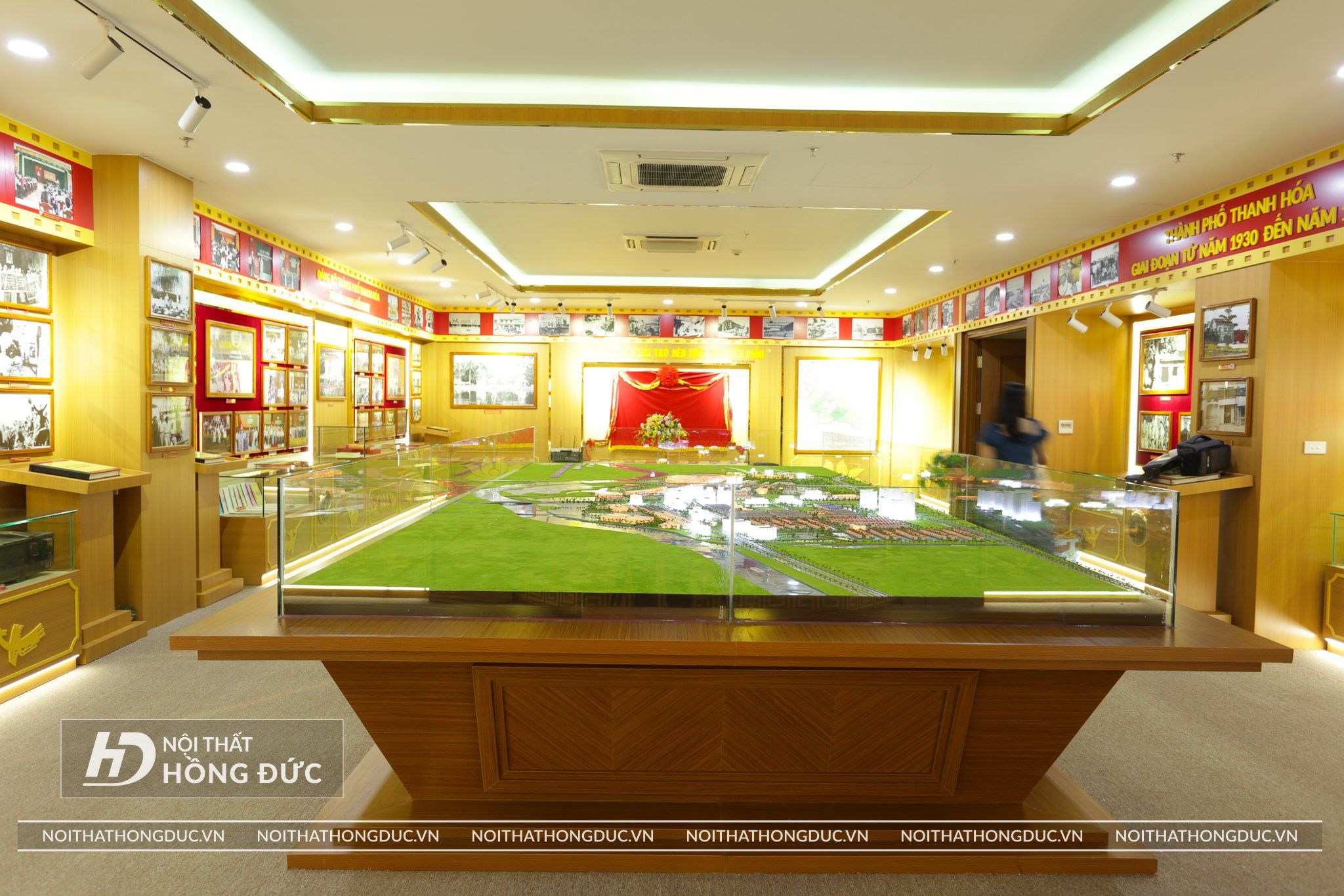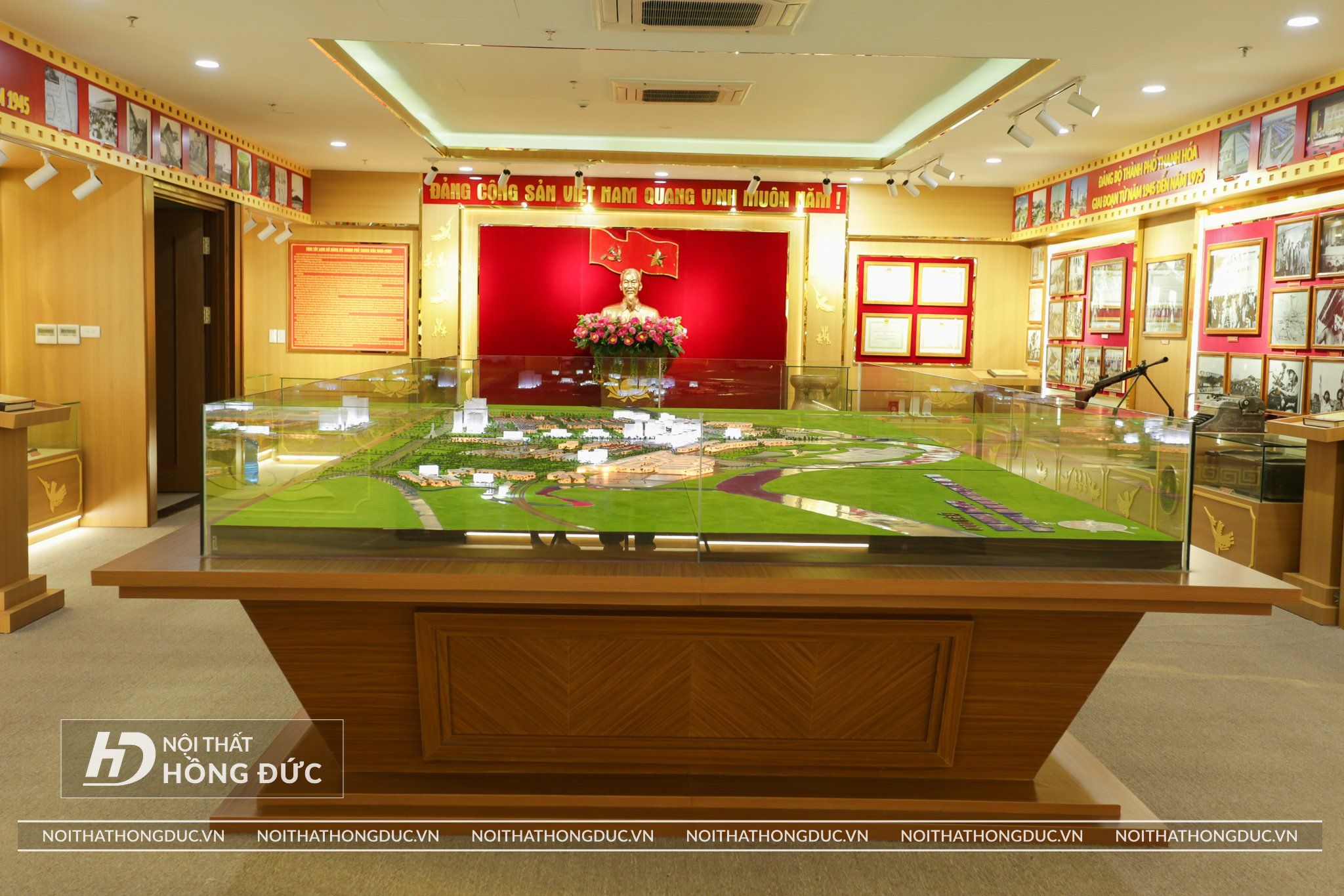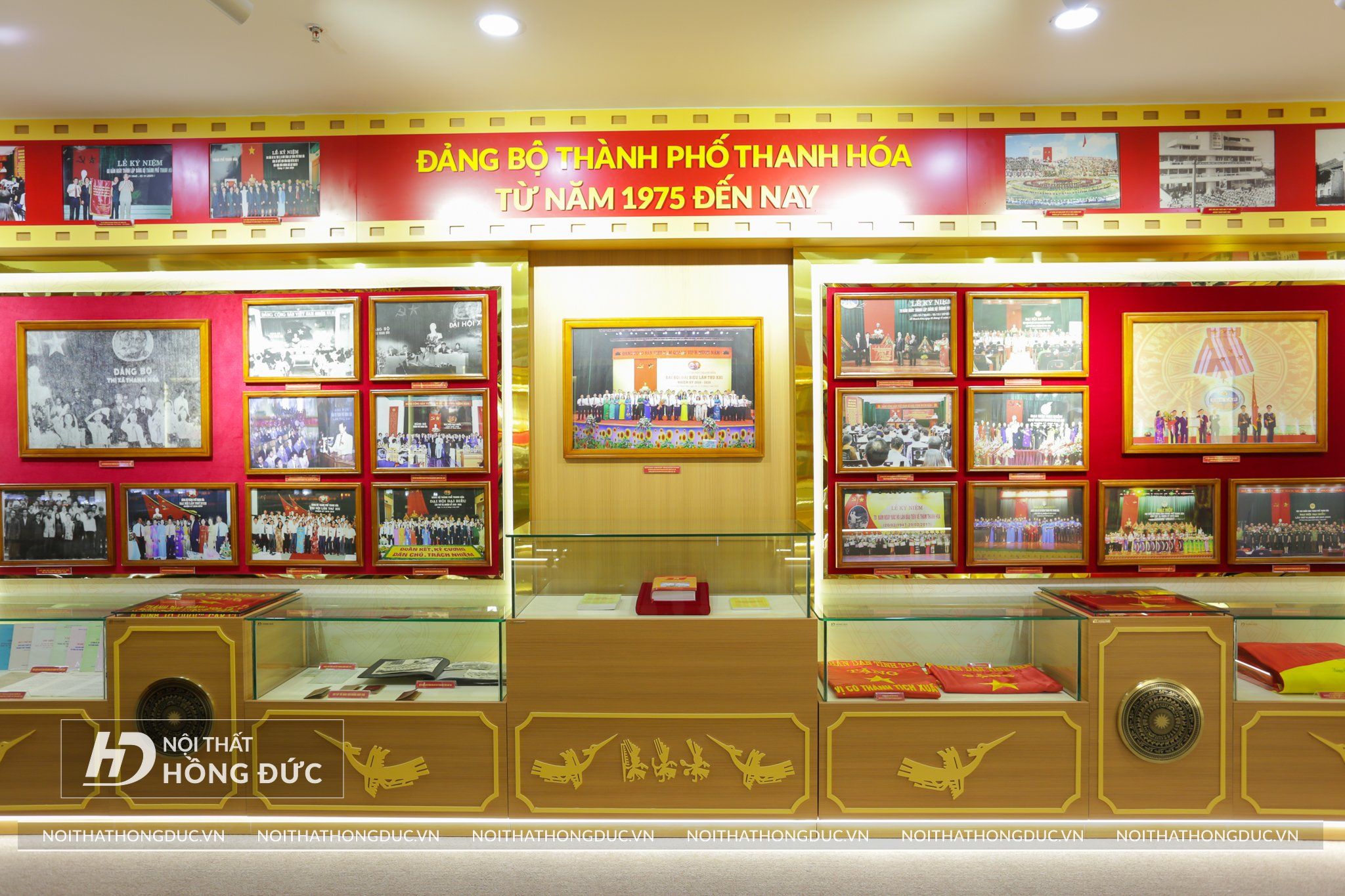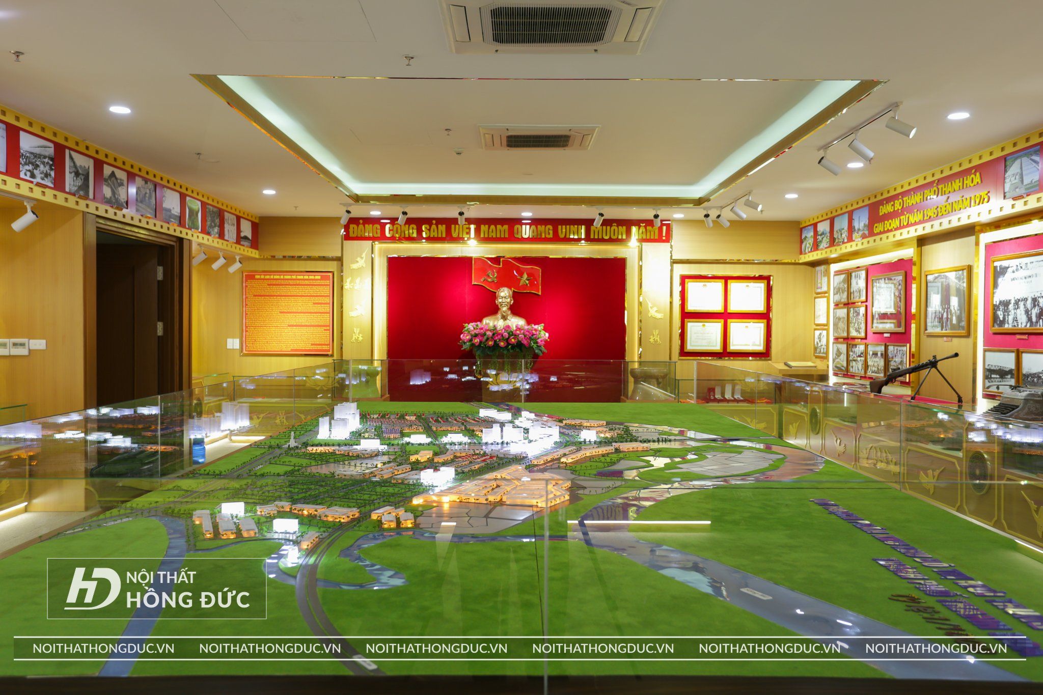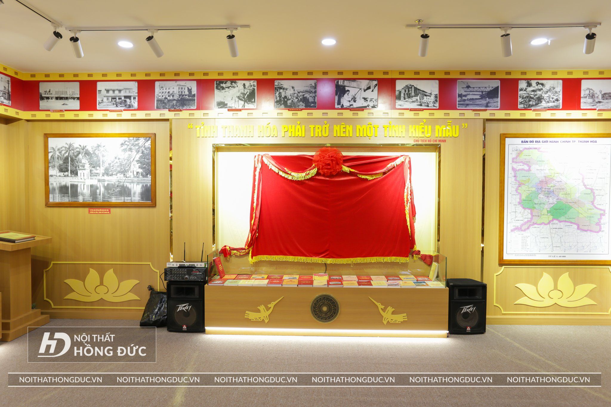 Nội thất Phòng Truyền thống UBND TP.Thanh Hóa được Nội Thất Hồng Đức thiết kế và thi công hoàn thiện trong vòng 20 ngày, Các tư liệu, hình ảnh, hiện vật về Thành ủy TP Thanh Hóa qua các thời kỳ được trưng bày trực quan trên các tủ kính ốp tường và đặt trên sàn; đồng thời, sử dụng album kỹ thuật số và các công nghệ, kỹ thuật mới về ánh sáng, âm thanh, hình ảnh,… tạo hiệu quả cao trong trưng bày.