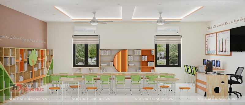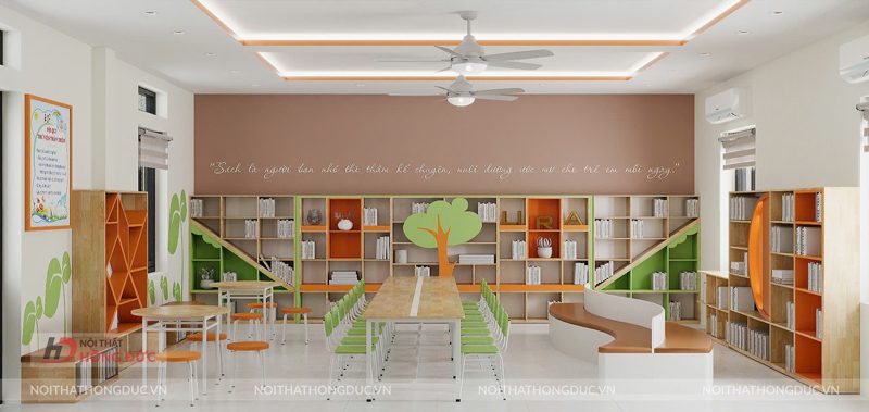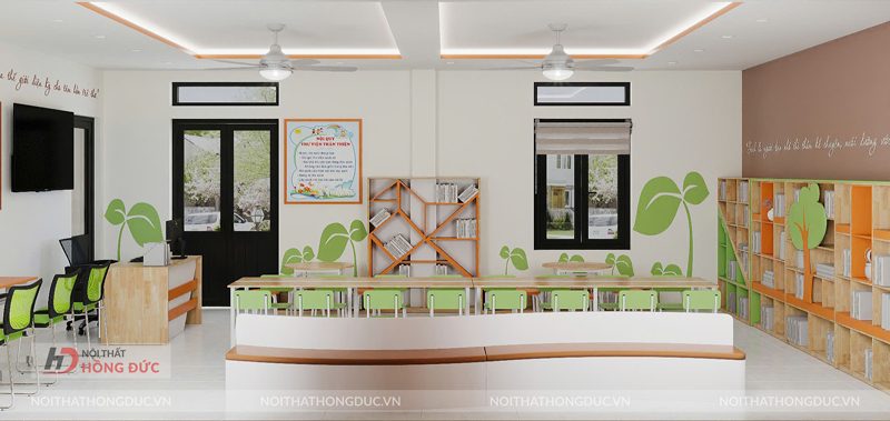 Thư viện được thiết kế theo phong cách hiện đại – thân thiện – giàu tính tương tác. Toàn bộ không gian sử dụng gam màu cam – xanh lá – gỗ sáng, mang đến cảm giác gần gũi, tươi mới và tràn đầy năng lượng. Các chi tiết như hình cây xanh, giá sách cách điệu hình khối, ghế ngồi sinh động… được bố trí hài hòa, tạo nên sự hứng thú cho các em khi bước vào không gian đọc sách.