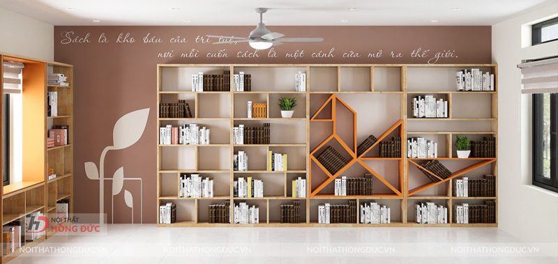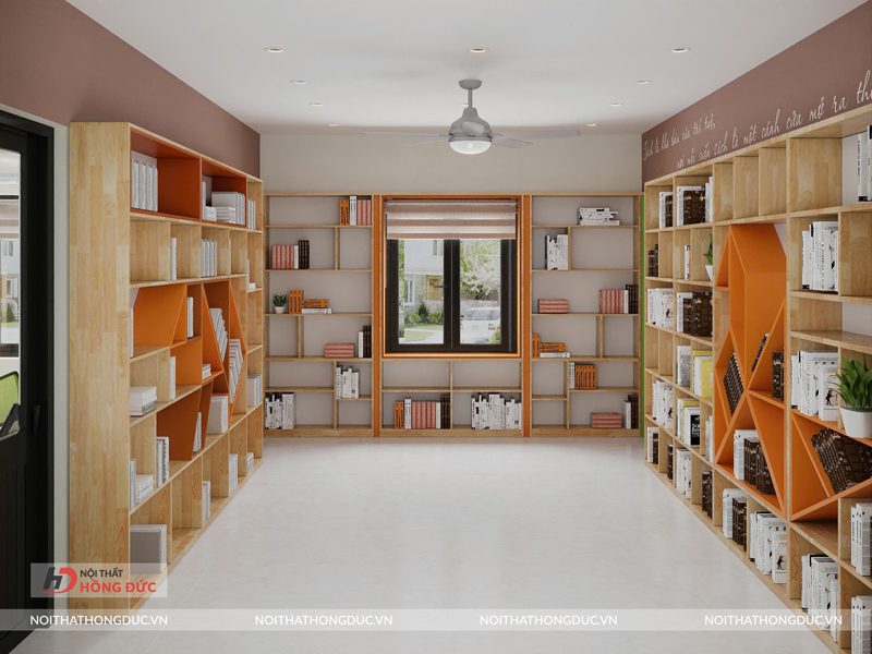 Hệ thống kệ sách đa dạng: Thiết kế mở, nhiều hình khối sáng tạo, vừa lưu trữ hiệu quả vừa tạo sự cuốn hút trực quan.