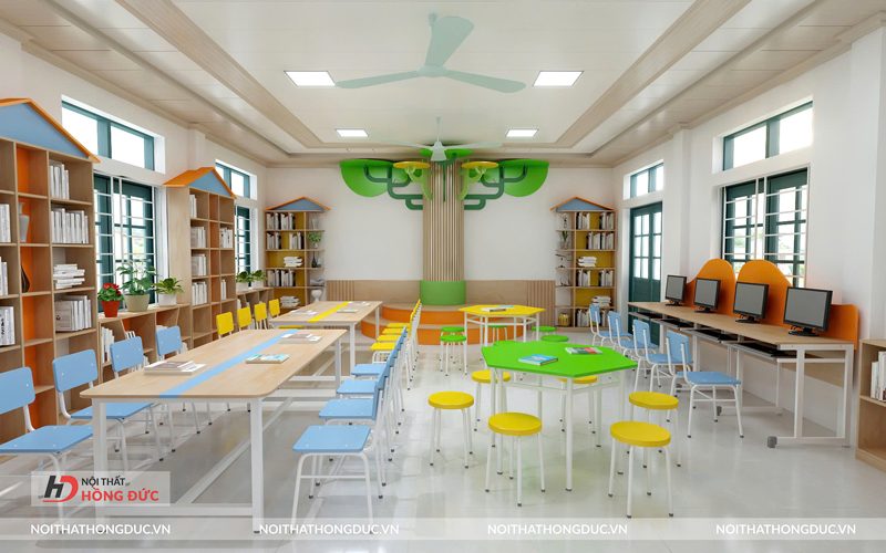• Khu đọc sách và tra cứu tài liệu: Hệ thống tủ sách được thiết kế cách điệu hình ngôi nhà, vừa tạo sự gần gũi vừa tăng tính thẩm mỹ. Sách được sắp xếp gọn gàng, khoa học, giúp học sinh dễ dàng tìm kiếm.