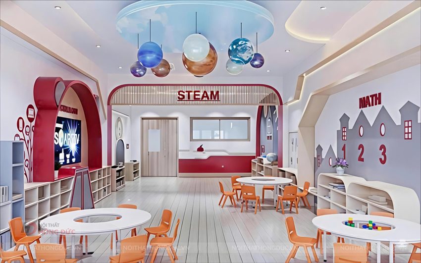 Năm 2026, nhiều trường định hướng xây dựng lộ trình STEAM cho 3 cấp: mầm non – tiểu học – THCS. Vì vậy nội thất cũng cần thay đổi phù hợp từng lứa tuổi.